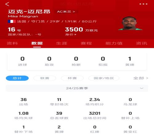 本赛季迈尼昂代表米兰出战36场比赛丢39球,完成11次零封。迈尼昂与米兰的现有合同将在2026年6月到期,他在米兰的税后年薪为280万欧元。续约后500万欧的年薪,将使迈尼昂与莱奥持平,成为米兰队内薪水最高的球员。