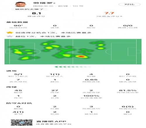 触球45次,传球27次,传球成功率81.5,关键传球2次