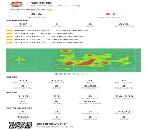 德弗里本场1球+4解围2封堵2拦截2抢断0被过获评8.4分全场最高