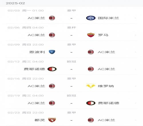 其中,北京时间2月3日将迎来本赛季意甲第二次米兰德比,3天后的2月6日在意大利杯迎战罗马;12日和19日在欧冠附加赛迎战费耶诺德,AC米兰先客后主。