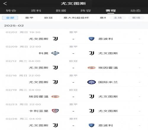 尤文将在北京时间2月12日4:00主场对阵埃因霍温,2月16日22:00主场迎来与国米的意大利国家德比,2月19日4:00赴客场与埃因霍温展开次回合较量。