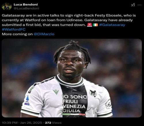 体育资讯1月26日报道宣称 据迪马济奥团队记者Luca Bendoni报道,加拉塔萨雷有意乌迪内斯外租至沃特福德的右后卫埃博索莱,正在积极进行谈判。