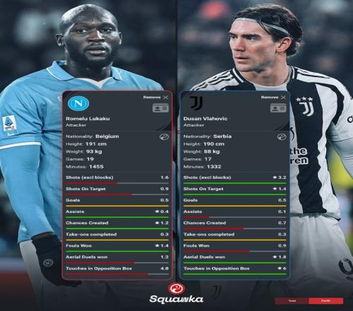 弗拉霍维奇(尤文,17场):射门3.2次、射正1.4次,进0.5球,助攻0.1次,创造机会0.7次,成功过人0.3次,造犯规0.9次,成功争顶1.8次,对方禁区内触球6次