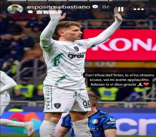 对阵国米进球,S埃斯波西托社媒向国米球迷道歉并感谢球迷的掌声