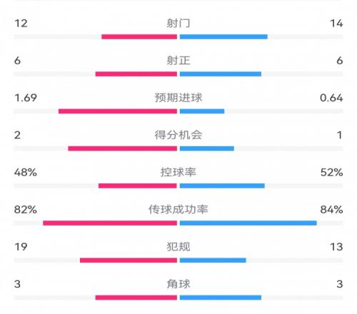 国米22博洛尼亚数据:射门1214,射正66,得分机会21