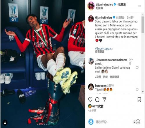 赖因德斯社媒晒出在更衣室与奖杯的合照,配文:“非常高兴赢得我在米兰的首座奖杯,我为这支球队感到无比自豪——这给我们的未来注入了巨大的推动力!这是我们球迷应得的荣誉。”