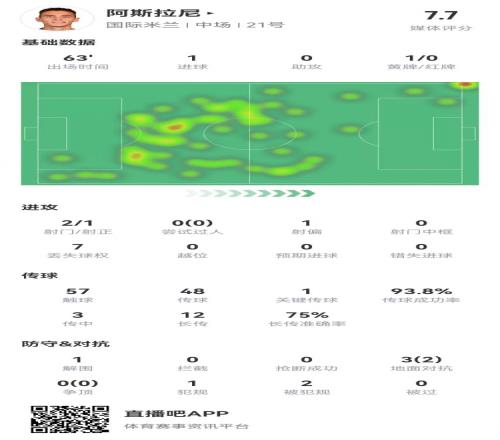 体育资讯12月20日报道宣称 国米在本轮意大利杯对阵乌迪内斯,阿斯拉尼本场数据如下: