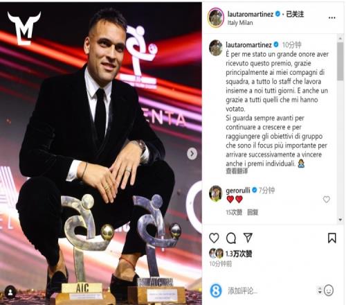 劳塔罗写道:“我很荣幸能获得这个奖项,主要感谢我的队友,感谢每天与我们一起工作的所有工作人员,同时也感谢所有为我投票的人。”