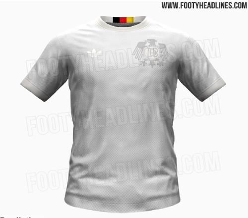 这套球衣主体为白色,Logo也淡色处理,没有什么花哨的设计。阿迪达斯很可能使用三叶草Logo,加上经典的德国足协标志(有可能是1900年的第一款标志)。