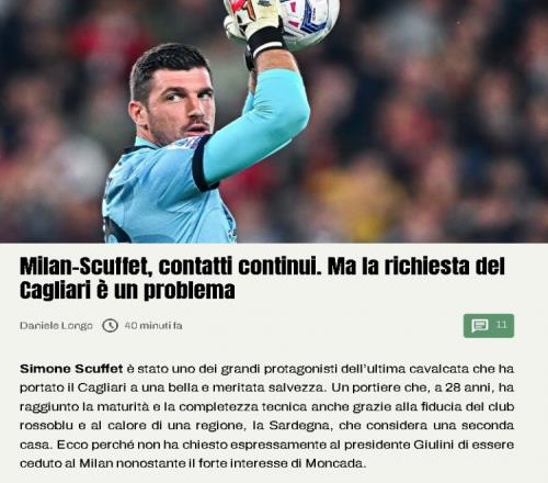 目前主要分歧在于转会费用,卡利亚里方面希望以租借+买断形式出售斯库费特,费用500万欧元。而米兰方面正在权衡是否继续使用年轻门将的信任,或者是争取签下斯库费特。