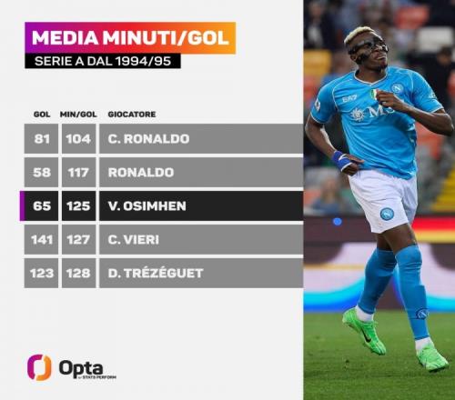 体育资讯7月23日报道宣称 Opta统计了1994-1995赛季以来球员在意甲的进球效率,并列出榜单,C罗以104分钟1球居首,大罗、奥斯梅恩排名二三位。
