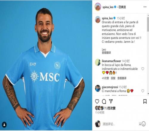 体育资讯7月11日报道宣称 意大利31岁左后卫斯皮纳佐拉免签加盟那不勒斯,他更新社媒动态,发表了加盟球队的感想。