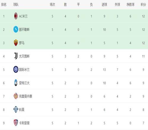 在积分榜上,前3名的积分都一样,都是12分。AC米兰赢下那不勒斯之后,以净胜球的优势,排名榜首。那不勒斯5个净胜球,排名第2。第3 的是罗马,4个净胜球。尤文图斯3胜2平的战绩,拿到11分,排名第4。国际米兰以9个积分排名第5。亚特兰大和克雷莫内塞也是9分。拉齐奥的战绩就非常差了,1胜3负,只拿到3分,排名第14。
