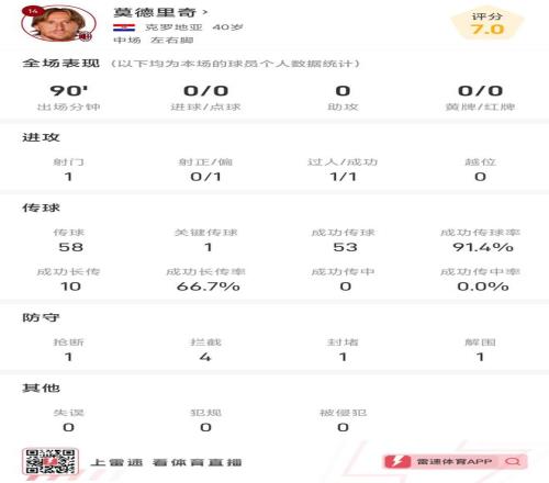 莫德里奇传球成功率高达91.4%,完成1次成功过人,防守端1次抢断、4次拦截、1次封堵、1次解围。