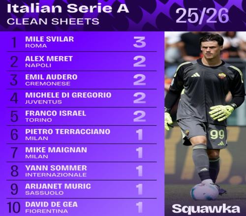 雷速体育9月26日报道宣称 据外媒统计,本赛季罗马门将斯维拉尔3场零封领跑意甲联赛。