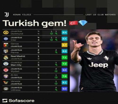 尤文在本轮欧冠主场4-4战平多特,伊尔迪兹贡献传射。数据统计显示,他为尤文各项赛事最近10场比赛贡献6球7助攻:其中4-4多特1球1助攻、4-3国米1球1助攻、2-0帕尔马2助、2-5曼城1助。