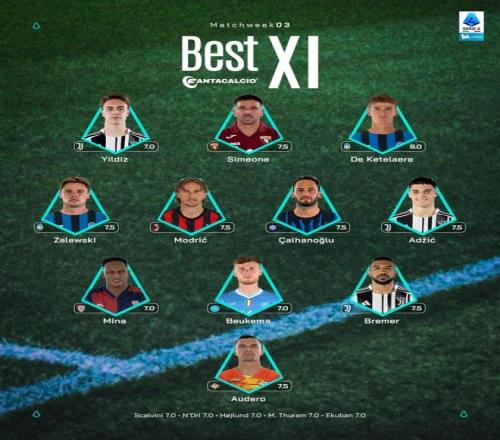 意甲联赛官方今天公布了意甲第三轮最佳阵容,具体如下: