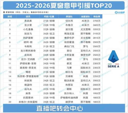 意甲夏窗TOP20:米兰包揽前二,恩昆库3700万标王亚沙里3600万