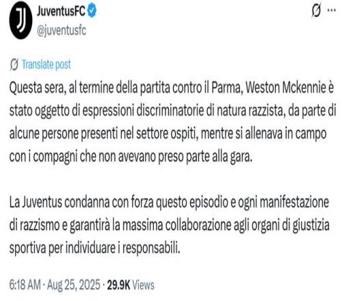 雷速体育8月25日报道宣称 意甲首轮比赛,尤文图斯2-0轻取帕尔马。本场比赛,麦肯尼等尤文球员遭到了帕尔马极端球迷的种族歧视。尤文官方发布公告,具体如下: