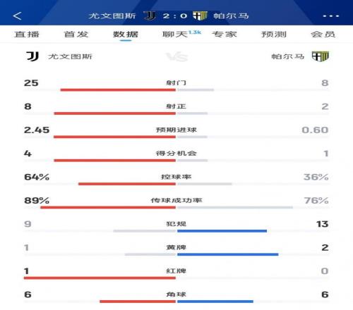 尤文图斯20帕尔马全场数据:射门258、射正82、得分机会41