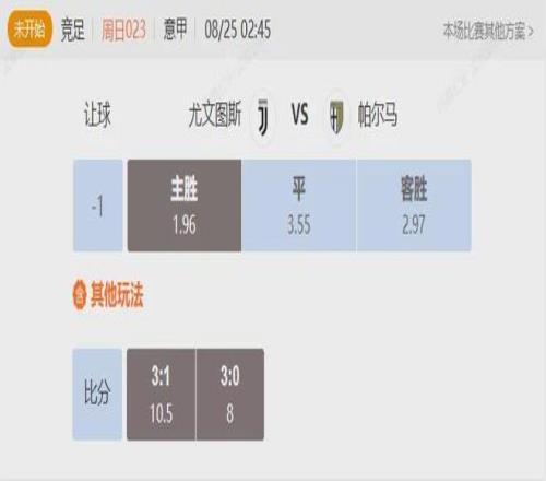 帕尔马上赛季保级多少有些人情意味,看亚特兰大最后一轮的输球,以及尤文图斯的一胜一平。这些都是这个赛季要还的,新赛季首战,看好尤文图斯轻取对手。
