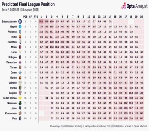 Opta预测25-26赛季意甲排名: