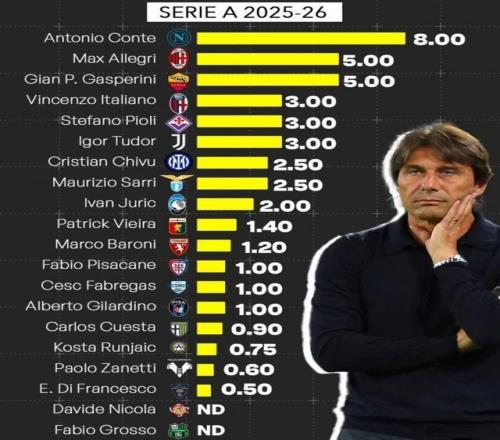 直播吧08月06日报道宣称 今日,意大利金融媒体Calcio e Finanza统计了25-26赛季意甲各队主帅的年薪排行。