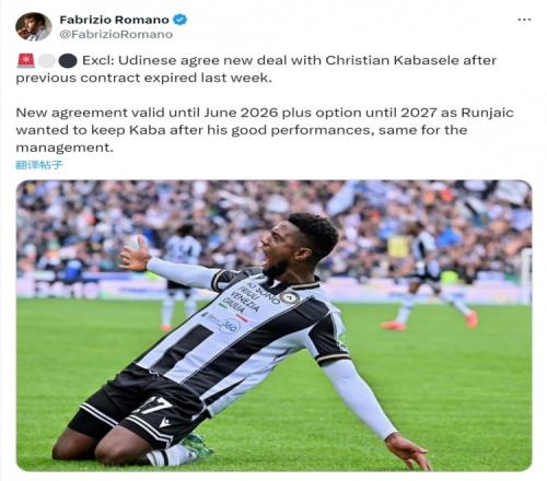 体育资讯7月3日报道宣称 据知名记者罗马诺报道,乌迪内斯与卡巴塞莱就续约达成协议。