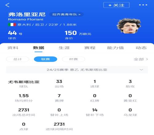 罗马诺-弗洛里亚尼-墨索里尼,现年22岁,司职右后卫,上赛季被拉齐奥外租至尤韦斯塔比亚效力,共在意乙出战33场比赛,贡献1球3助。