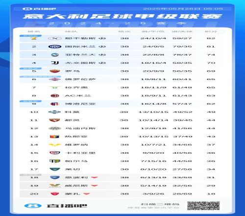 体育资讯05月26日报道宣称 2024/25赛季意甲收官,罗马2-0战胜都灵,拉涅利率队取得第五名的成绩,获得欧联杯资格。