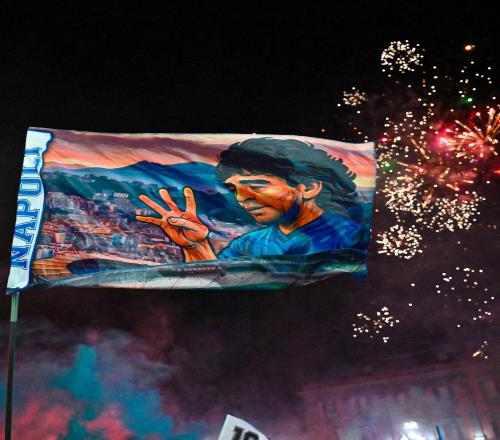 在那不勒斯球迷的庆祝队伍中,球迷也高举马拉多纳的海报。
