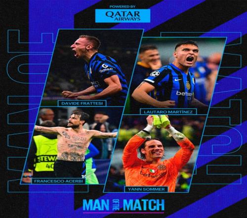 体育资讯5月7日报道宣称 不久前,国米官方进行了4-3巴萨的最佳球员票选活动,弗拉泰西、劳塔罗、阿切尔比和索默进入候选名单。