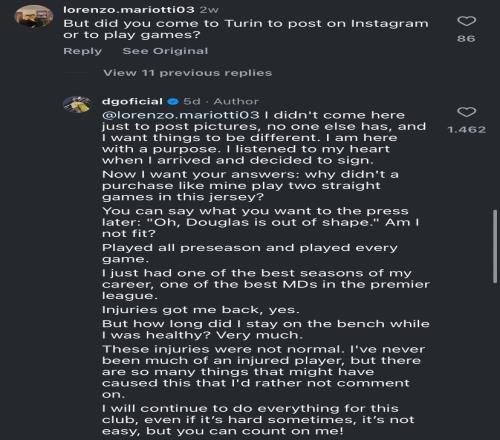 道格拉斯-路易斯在社交媒体上回复一名球迷,表示自己曾是英超最佳中场之一,但加盟尤文后没有获得稳定的出场机会,在替补席上的时间太多。