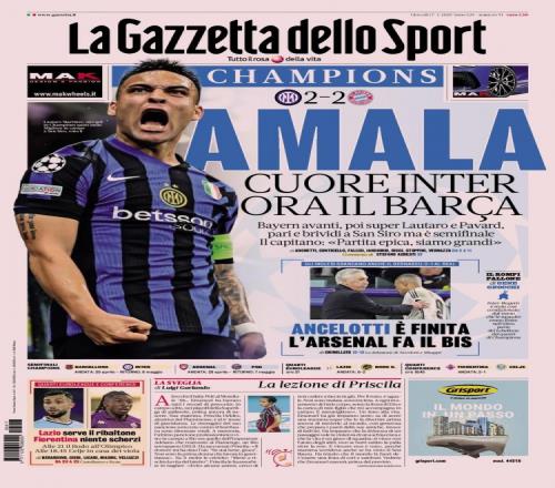 米兰体育报头版还写道:国米团结一心,现在要考虑战巴萨。本场比赛拜仁先进球,之后劳塔罗和帕瓦尔挺身而出,梅阿查出现一场令人颤栗的平局,不过国米进入了半决赛。队长:“史诗般的比赛,我们打出了伟大表现。”