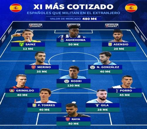 在海外踢球的西班牙球员最贵阵容:罗德里1.3亿欧元领衔