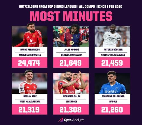 体育资讯05月21日报道宣称 据Opta统计,B费自2020年加盟曼联以来,他在俱乐部的所有比赛中总出场时间为24474分钟。这比来自五大联赛的任何其他非门将球员至少多出2825分钟(或每90分钟多出31.4分钟)。