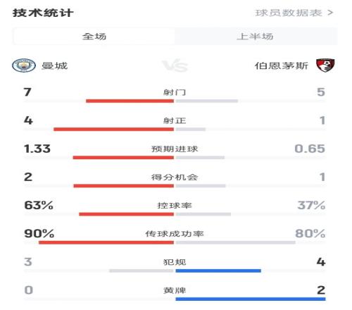曼城半场20伯恩茅斯数据:射门75,射正41,控球率63%37%