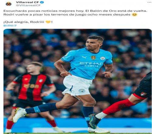 老东家比利亚雷亚尔官方社媒晒出罗德里的赛场照片,并写道:“今天你不会听到比这更好的消息,金球奖得主回归,罗德里缺席8个月后重返赛场!真的为你感到高兴,罗德里!”
