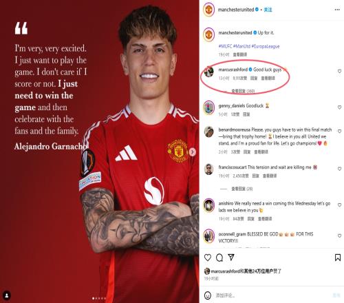 拉什福德在曼联该动态下留言写道:“祝你们好运,兄弟们✨”
