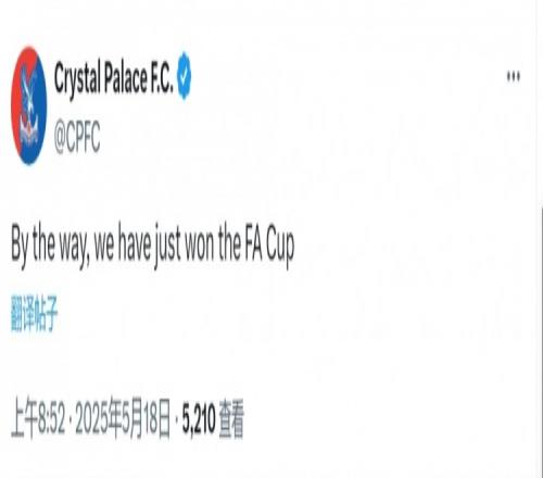 当地时间凌晨1点52分,水晶宫社媒发文:“顺便说一下,我们刚刚赢得了足总杯冠军。”