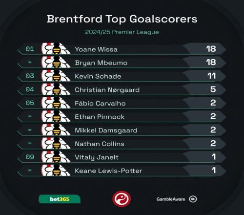 据Squawka数据统计,布伦特福德是本赛季英超唯一一支3名球员进球上双的球队,维萨、姆贝莫均打进18球,沙德打进11球。