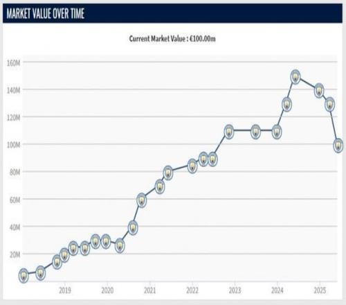 23/24赛季,福登在英超代表曼城出战35场收获19球8助(总数据53场27球12助),当选英超赛季MVP,个人身价也是涨到了1.5亿欧。上赛季福登遭遇脚踝伤势,各项赛事(包括世俱杯)49场13球7助,身价从1.5亿跌回1亿欧。