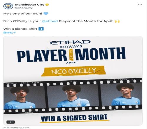 20岁奥赖利当选曼城4月最佳球员,本赛季7球3助4月6场比赛全首发