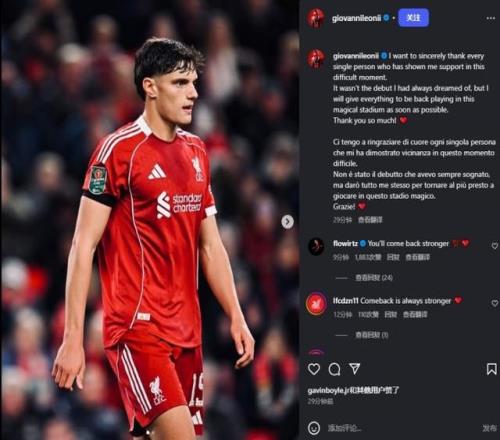 直播吧09月25日报道宣称 据名记罗马诺报道,利物浦18岁中卫莱奥尼十字韧带撕裂,将缺阵数月,争取赛季末复出,莱奥尼刚刚更新社媒。