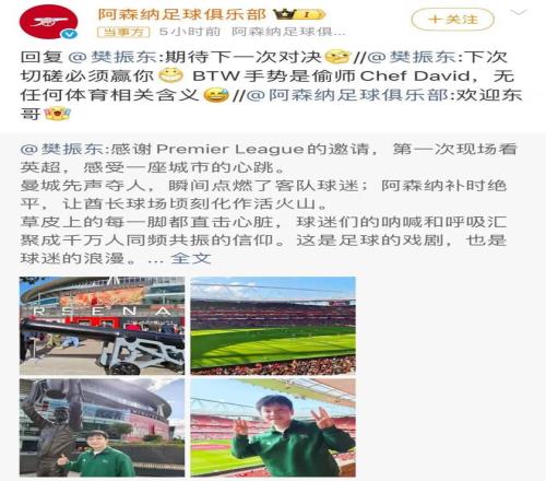 樊振东与阿森纳足球俱乐部互动。阿森纳官方表示欢迎东哥。
