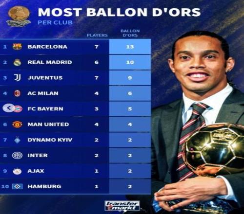 俱乐部金球数量排名:巴萨7人获奖13次居首、皇马6人10次第二