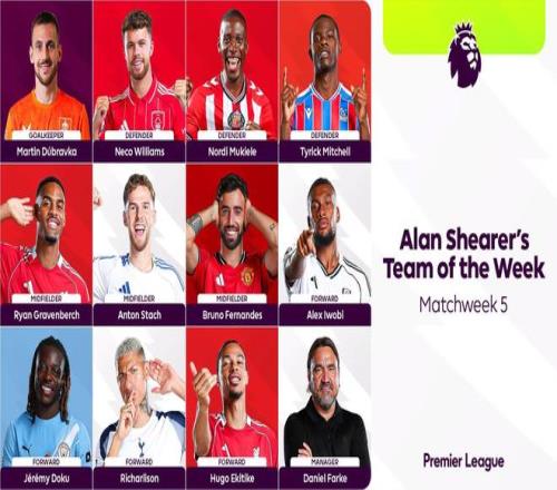 英超官方公布了阿兰-希勒评选的英超第5轮最佳阵容,埃基蒂克领衔,布鲁诺-费尔南德斯、赫拉芬贝赫、里沙利松、多库等人在列。