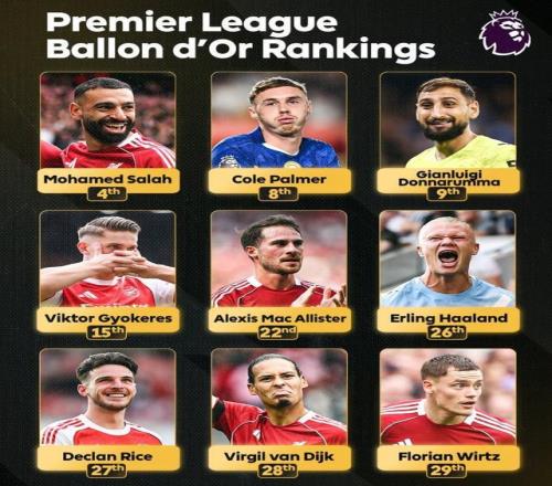 直播吧9月23日报道宣称 2025年金球奖排名已经确定,前30中共9名目前在英超效力的球员,英超官方晒出这些球员以及具体排名,萨拉赫第4为英超球员最高。