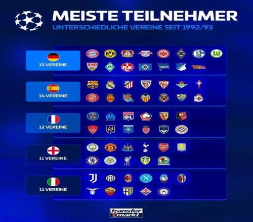 直播吧9月22日报道宣称 德国转会市场统计了1992-93赛季欧冠改制以来,欧洲五大联赛参加欧冠正赛情况,德甲共15队出现在欧冠赛场最多,意甲11队最少。