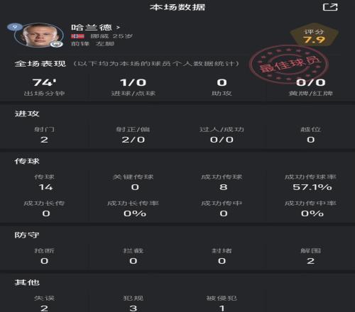 哈兰德此役关键数据: